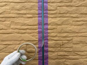 シーリング材が目地の底に接着しないようにするためのテープを貼り付けます。