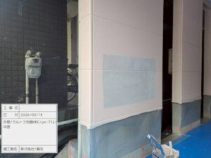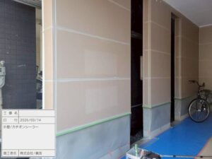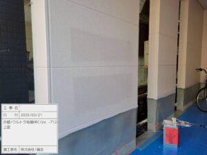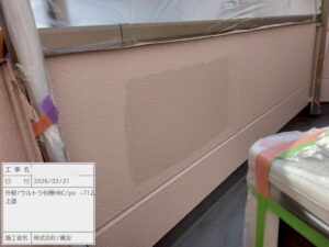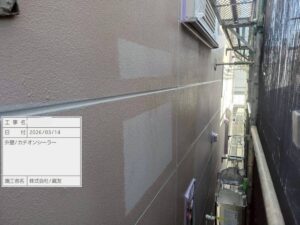 まず、カチオンシーラーで劣化した外壁の補強します。下地の吸い込みを抑え、剥がれ・膨れを防止します。