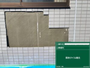 今回は②のタイルの浮きが見られたので不良部分のタイルを撤去して新しいタイルを張り替える施工方法で工事を行いました。