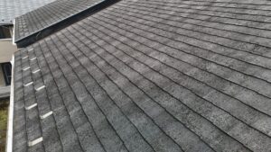 屋根全体に色あせや黒ずみが見られ、防水性能が落ちている状態です。