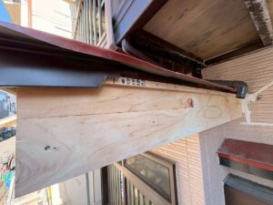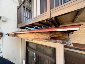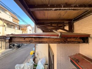 写真のように木下地が腐食している状態では強度がほぼ無く、支える力が足りず、強風・積雪・振動で、庇が落下する危険があります!