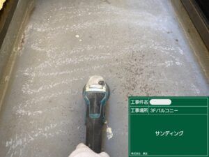 既存防水層の表面をしっかり研磨することで汚れや劣化部分を除去し、密着性を高めます。